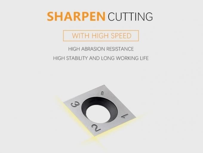 Ισχύστε για το ξύλο γενικού σκοπού, χαρτόνι, κοντραπλακέ, MDF/HDF, τα υψηλής επίδοσης αντιστρέψιμα και καταχωρήσιμα ένθετα καρβιδίου αντικατάστασης τετραγωνικά έχουν 4 εξέχουσες θέσεις.